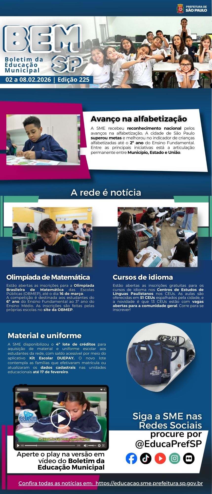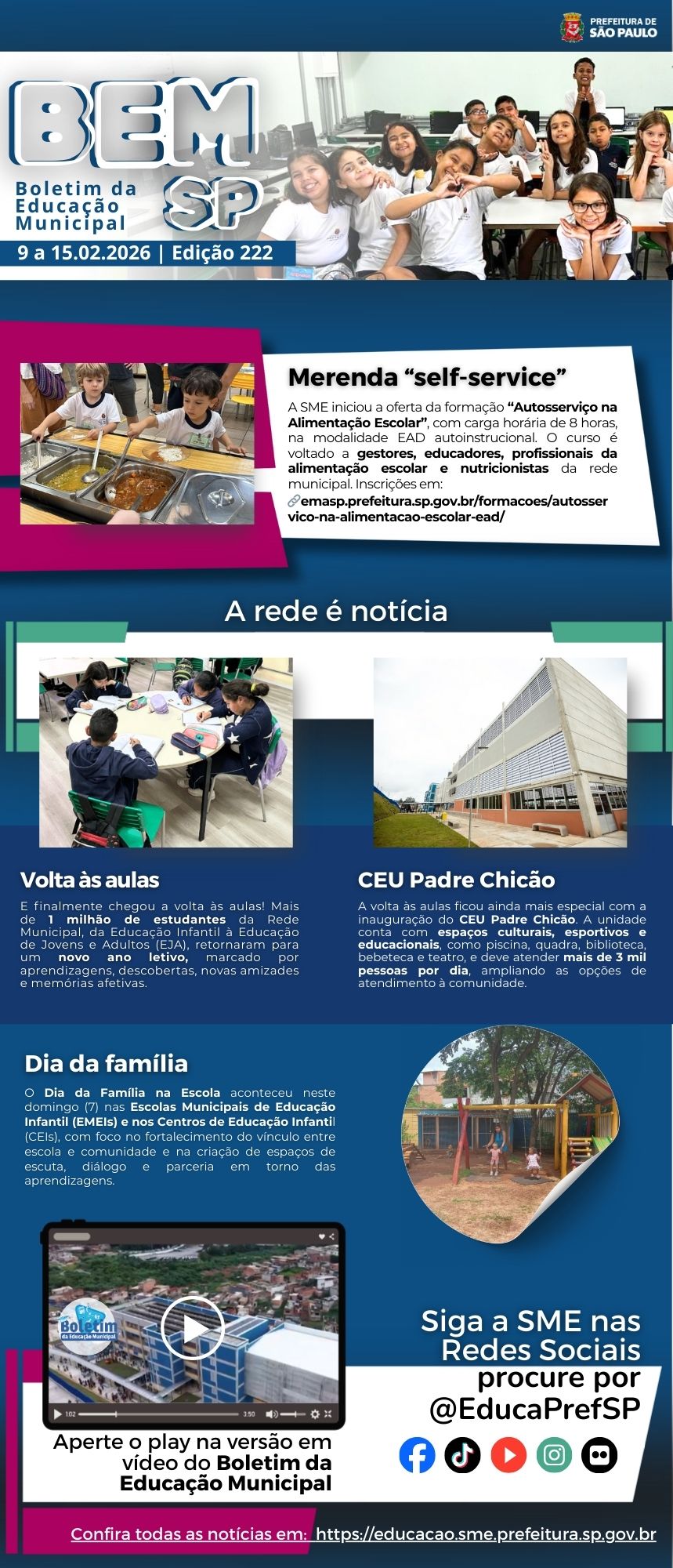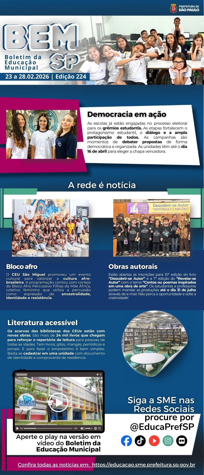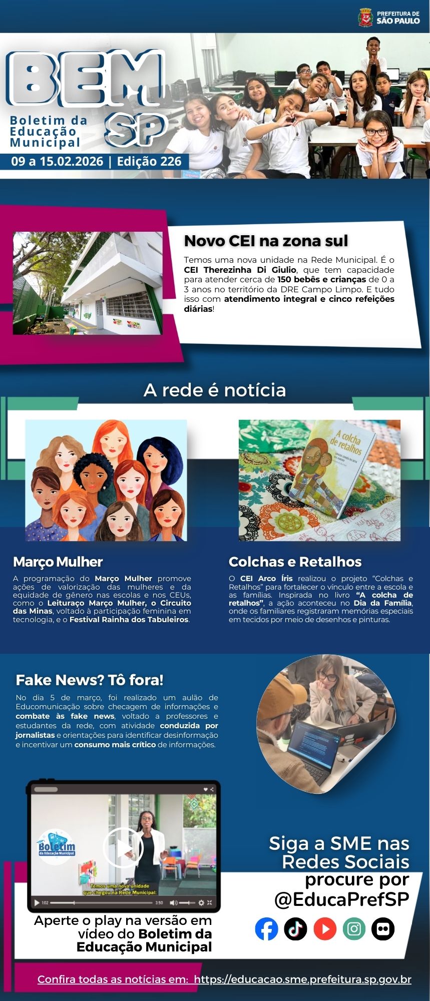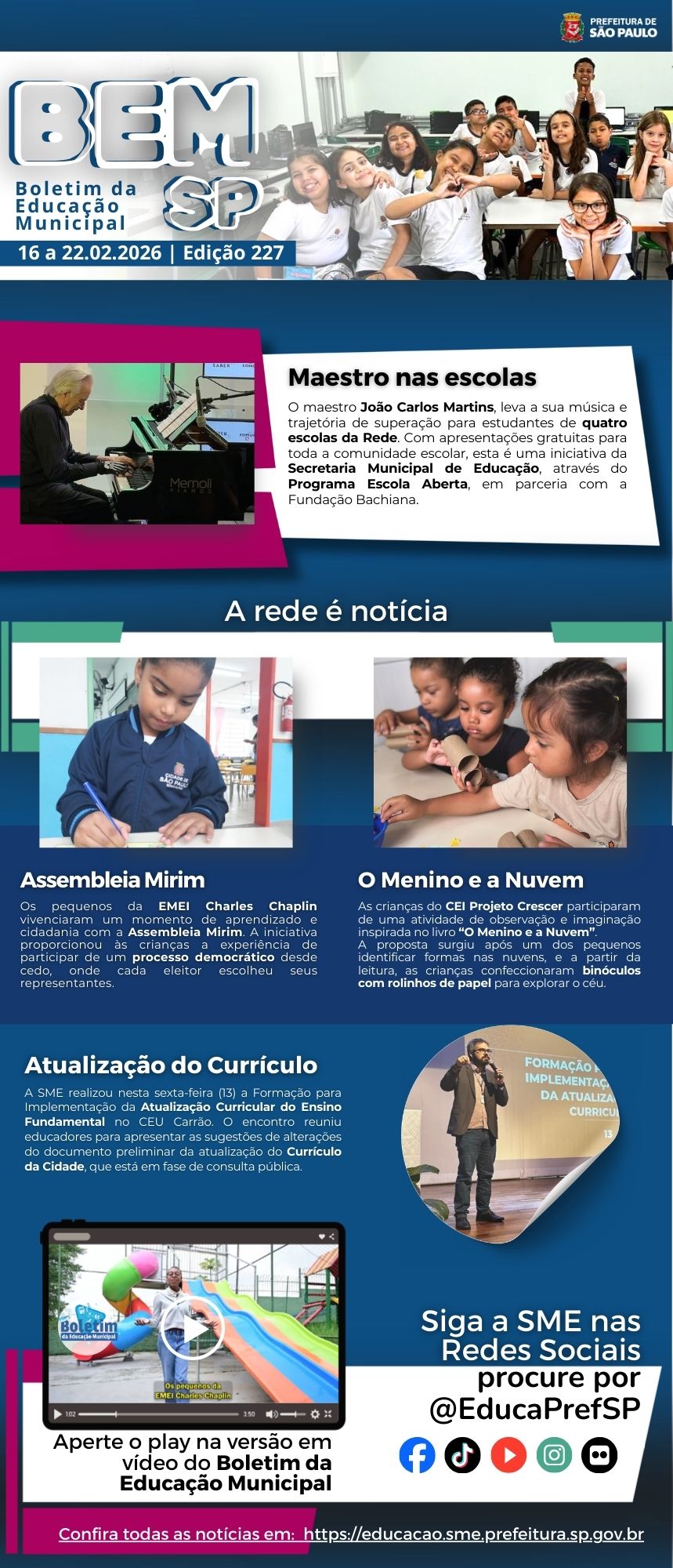 Confira o Boletim da Educação Municipal de São Paulo. Um espaço para a divulgação de ações, projetos, programas e histórias da nossa rede de educação. Assista e envie sugestões para as próximas edições.