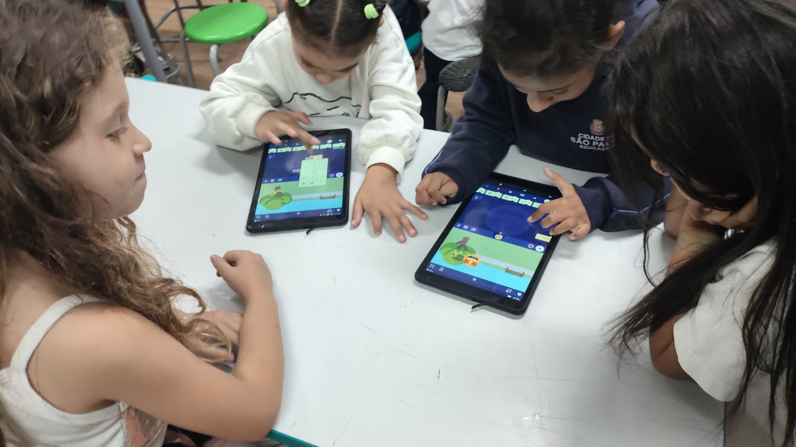 Estudantes do 1º ano da EMEF Frei Galvão participam do projeto “Cultura Popular e Tecnologias para Aprendizagens”, que articula danças, músicas, histórias e gincanas da cultura maranhense a atividades de programação, robótica e cultura maker. Desenvolvida nas aulas de Território pelo professor orientador de educação digital Gilberto Araújo, a iniciativa utiliza manifestações do Cacuriá do Maranhão como ponto de partida para o desenvolvimento de habilidades como pensamento computacional, criatividade e autonomia.