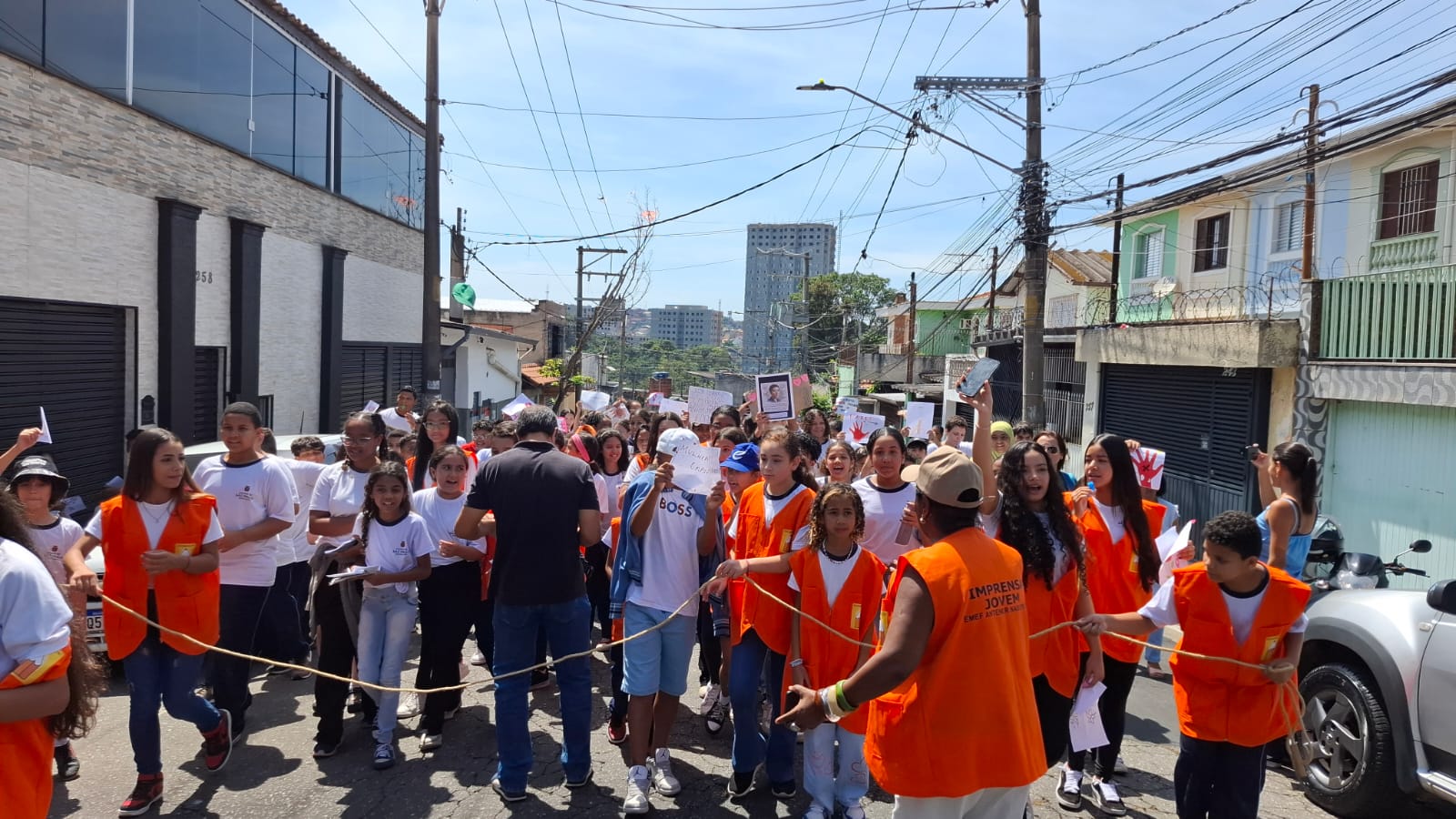 A iniciativa reuniu cerca de 180 estudantes dos 5º e 9º anos do Ensino Fundamental, que caminharam pelas ruas próximas à unidade acompanhados por professores e pela equipe escolar. A ação contou ainda com o apoio da Guarda Civil Metropolitana (GCM), que auxiliou na segurança durante o percurso.