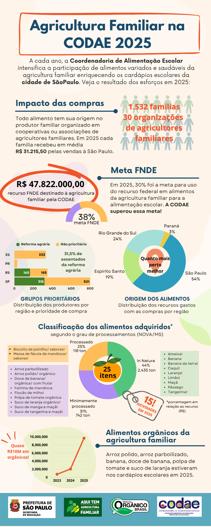 A relação e o compromisso da CODAE com o tema têm se consolidado e expandido e passaram a constituir um eixo estratégico norteador das diretrizes da Coordenadoria. A CODAE ampliou expressivamente o volume de aquisições deste perfil de compra pública, sempre focando na compra local e no respeito aos hábitos alimentares da população.